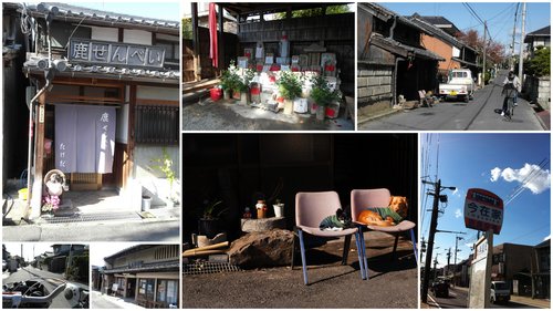 從奈良豆比古神社到東大寺之間這段,實在太適合騎車了,很多有趣的東西,有給鹿仙貝的店、有馬米酒店,還有穿毛衣曬太陽的兩隻狗狗...,一直騎到'今在家'的公車站牌才又回到主幹道,但下個路口左轉進小路朝東大寺前進。
