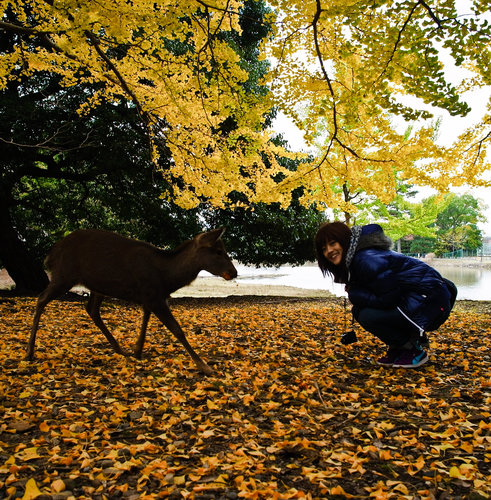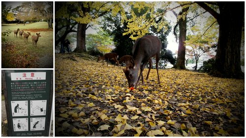 沿著大佛池往裡面走有片銀杏,竟然發現了好久不見的小鹿蹤跡,上趟追櫻的鹿不理小捷陰影深深烙印在我心中,加上還有看板提醒小心被鹿飛踢、衝撞、咬、頂,又想合照,又有些怕怕ㄟ...過不久竟然發現四隻排隊現身的鹿群,也太可愛了吧!