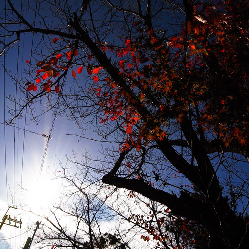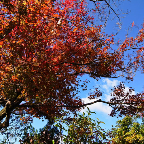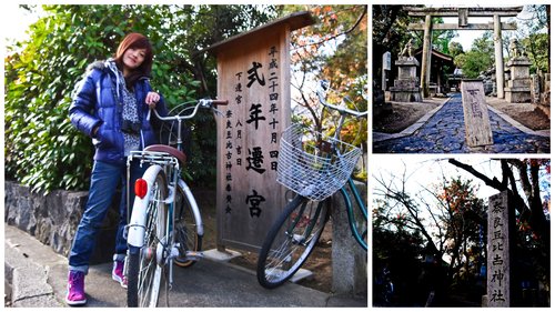 小巷的盡頭到了一條車流量相當大主幹道,就像不斷有砂石車呼嘯而過的省道,牽車過馬路真不容易耶!在不知騎了多久(應該至少30分鐘)後,終於到了奈良的第一站囉!門口有棵讓阿晡駐足許久的小楓,用他迷戀的方型猛拍...