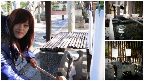 被強迫一定要拍的洗手,冷吱吱耶!好像是先洗左手,在洗右手,然後舀水放左手漱口,參拜前手口心都要潔淨一下喔!
