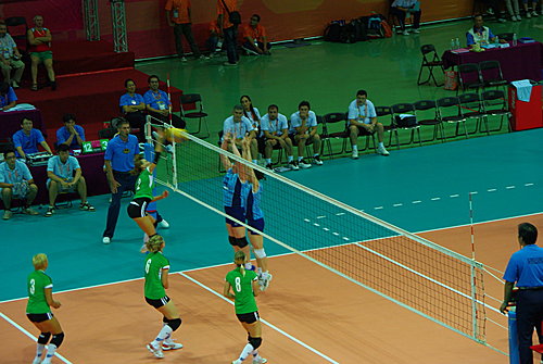 吃飽後,距離開賽還挺早的,先到隔壁體育館看了免費的聽奧排球賽,其實是想進去吹吹冷氣的。從小打排球,還第一次看現場的排球比賽,我覺得最棒的是,比賽結束後,綠色球隊還主動邀約藍色球隊一起合照,是用手語喔,少了殺戮血腥,多了令人會心一笑的溫馨耶。