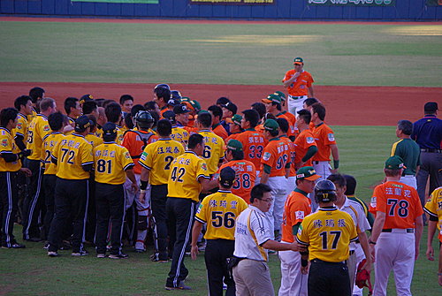 比賽中,因為觸身球引發了小衝突,球員們又聚集到球場中,這也是球賽過程中的SHOW...