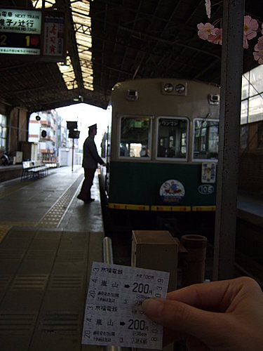 在嵐山停留的時間出乎意料的短暫,不到中午就搭著超迷你兩節車廂的《嵐電嵐山本線/北野線》前往北野白梅町!一出車站就看到傳七壽司、串八燒烤,心想等會再來大快朵頤唄!後來才發現這兩家店都到晚上才營業阿~帶著一絲絲遺憾前往北野天滿宮啦!