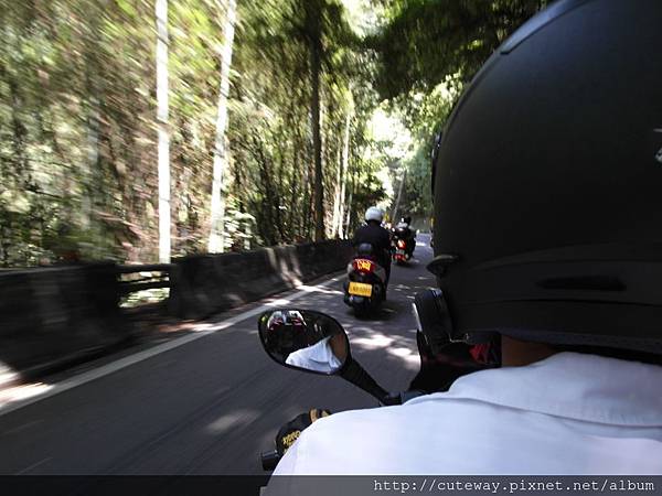 進入了單行道路段,兩旁林木高聳入天,陽光只是偶爾透過樹縫竄出來,相當舒服,小晡在這裡突然加入了別人的車隊裡。XD