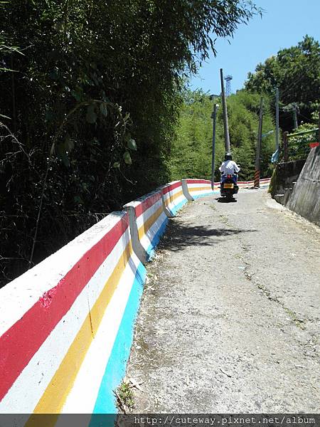 在吊橋上晃晃,先讓小晡把車騎上去,路旁的這個彩虹矮牆很亮麗耶...