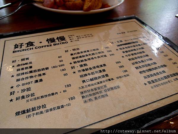 人數眾多有先電話訂位,但因早午餐有時間限制,心裡還有些忐忑不安。不似其他老房子早午餐路線,[好食慢慢]開在新大樓的1F,好停車的優點大加分!價位大概在每人200多,餐點好吃,但飲料就一般般。