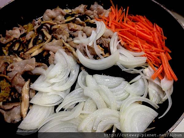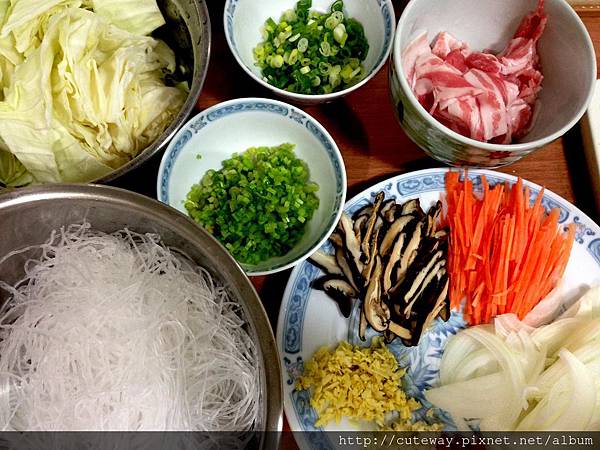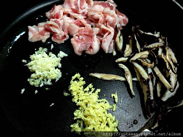 1.爆香組:豬肉片略醃.乾香菇泡水切絲.蒜末.薑末
