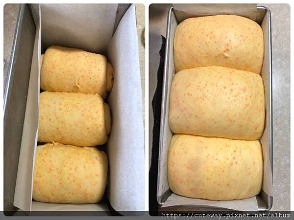 乾性材料稍為攪和,加入濕性材料(蛋、紅蘿蔔),因每款麵粉吸水力不同,牛奶可留一些,看狀況再決定要不要全部梭哈,麵糰呈現光滑狀態,再加入奶油打到吸收看不到就可以。麵糰打出薄膜跟出筋在一線之隔,所以我不強求薄膜,第一次發酵長2倍大、搓洞不黏手不回彈,就可以整形如下左邊,分三份麵糰,桿成長條狀再捲回;最終發酵長大到模具8-9分滿,就要趕快入爐烤了。