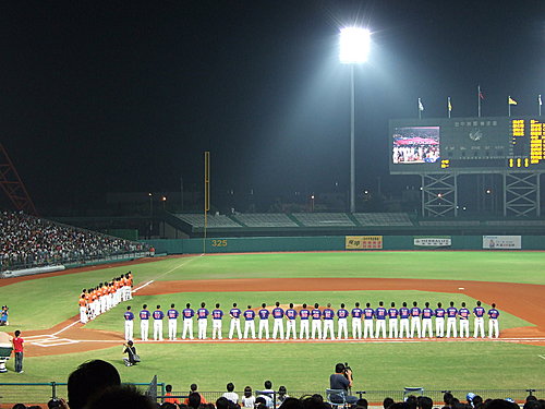 台中洲際棒球場的奧運熱身賽~中華隊VS統一7-11獅。布老爺上場時,到底是要用加油棒指向左外野?還是大喊被三振?...糾結矛盾阿~OPEN將整個大變身耶~除了球服~注意到沒?!連頭上的光環都換成青天白日滿地紅的代表色嚕^^